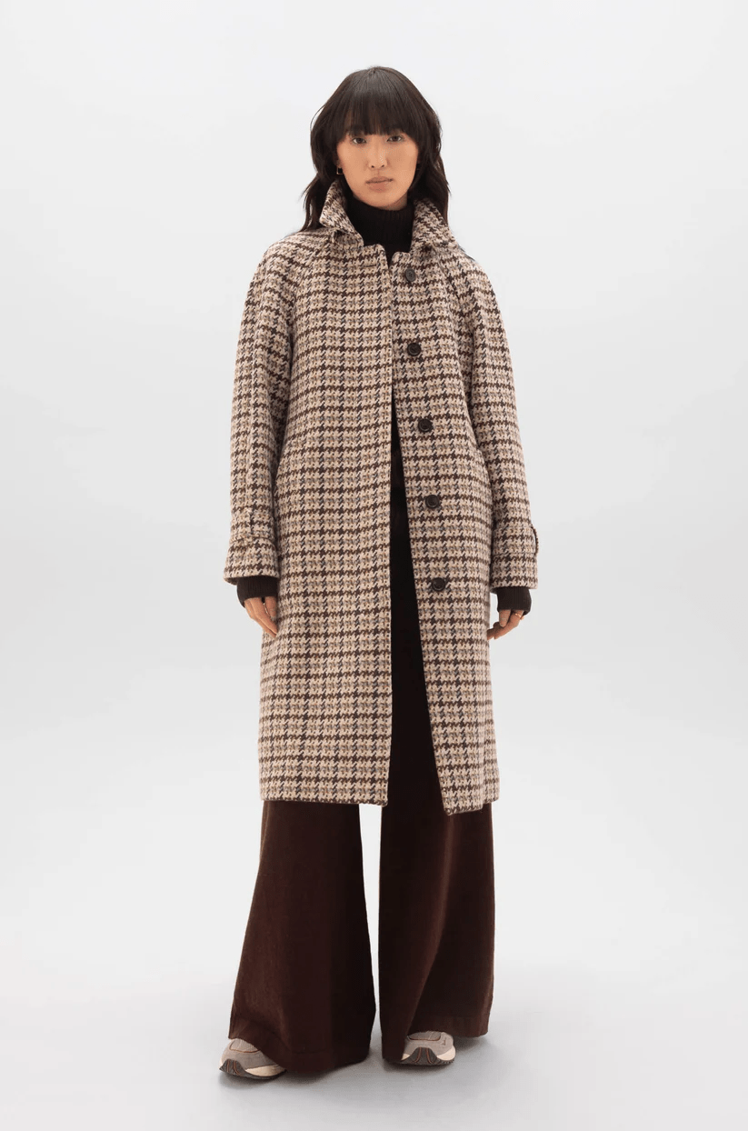 The Balmacaan allows you to add interest to your seasonal wardrobe, without compromising on comfort or style. Our blonde houndstooth 100% lambswool women’s overcoat is relaxed-fit, half-lined, with internally bound seams, double pockets, and raglan sleeves. The generous cut allows for ease of movement and accommodates cold weather layering, perfect over lofty cashmere knitwear.
