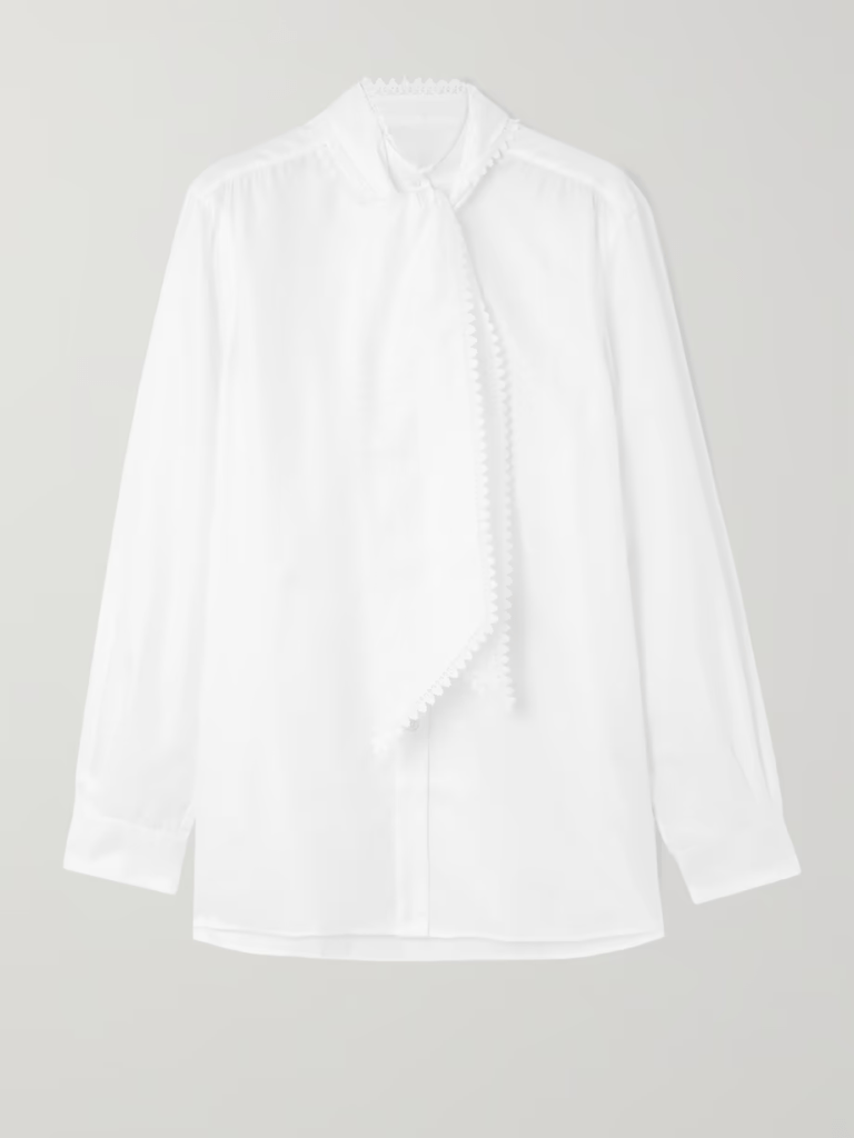 Claudia’s blouse is a Purdey Tie-detailed lace-trimmed cotton-poplin shirt £285 in Ivory. Purdey’s shirt feels eternally chic. It’s made from crisp cotton-poplin and has a high collar with lacy trims. Fasten the neck ties into a sweet bow.