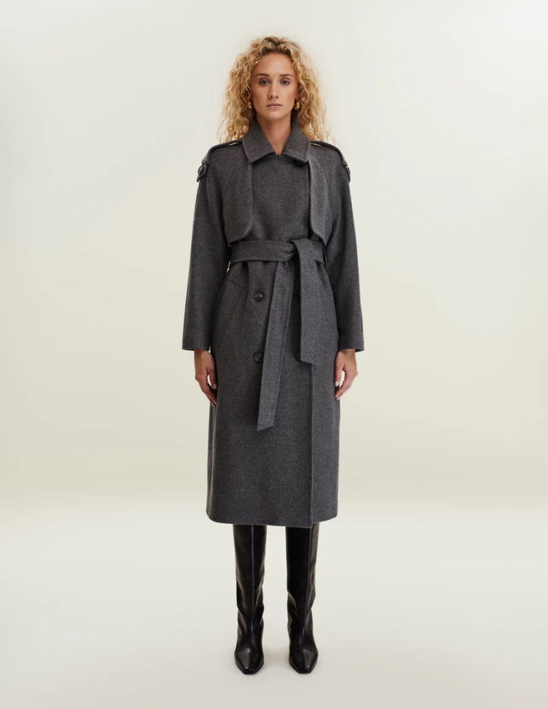 Claudia’s coat is a The Landskein Oracle Coat £816.09 in Dove Grey. Beautifully Tailored trench coat in fine Dove Grey Lambswool. Dove Grey weave. Defined shoulder, front, and back flap with belt. Woven exclusively for The Landskein by Molloy & Sons Donegal.
