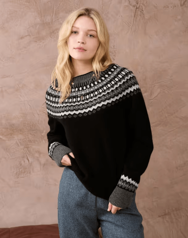 Claudia wore a Brora Supersoft Lambswool Fair Isle Yoke Jumper £155 in Black, for The Traitors on Wednesday 15th January 2025. Claudia was styled by Sinead McKeefry.
