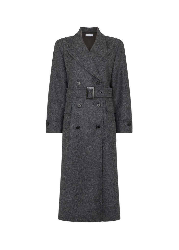 Claudia’s coat is a Bella Freud Jean Genet Coat £625 in Charcoal. Cocooned in grey wool. Powerful inside the Jean Genet coat. Grey Wool coat with button detailing, pockets and belt.