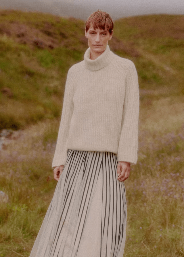 A champion of minimalism, this jumper is crafted from a tactile blend of merino wool, cashmere and silk with a fluffy texture. The soft cream colourway and classic long-sleeved silhouette are elevated with the addition of a detachable snood.