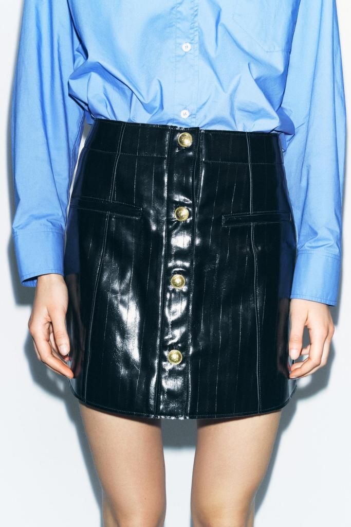 Cat’s skirt is a Zara ZW Collection Leather Effect Short Skirt £35.99 in Black. Mid-waist short skirt made of leather effect fabric. Featuring mock welt pockets on the front, flared hem and front fastening with raised metal buttons.