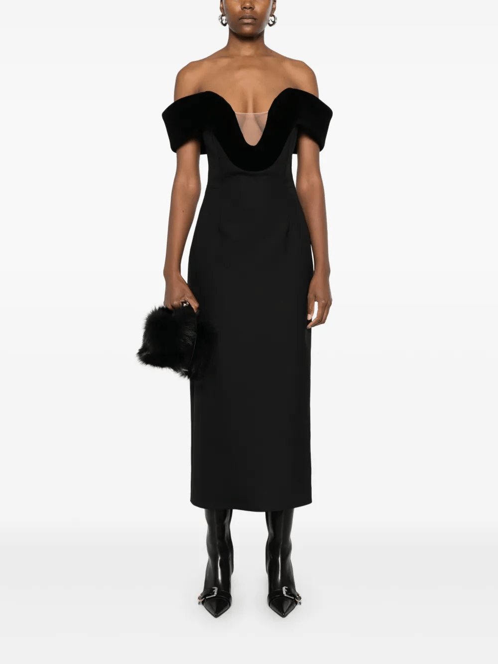 Made in the UK with tailoring wool, this midi dress is decadently structured and features a velvet wave design off-the-shoulder neckline with a tulle insert at the bust. It fastens with a zip closure at the back.