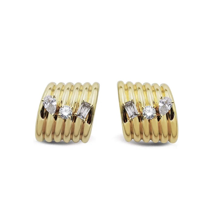 Holly’s earrings are Heavenly London The Gold Sienna Earrings £140. Step into the spotlight with the Sienna Earrings: a mesmerising blend of elegance and edge. Crafted with recycled silver, these ridged demi-hoops boast a lightweight design with effortless wearability from day to night. Adorned with three mini stones at the center, each sparkling detail catches the light with irresistible charm.
