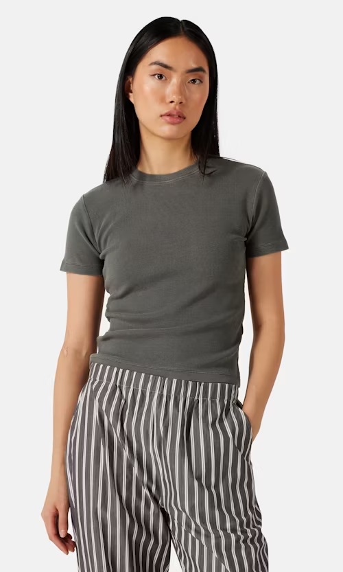 Ribbed washed t-shirt from Junkyard is the perfect basic tee. With a slight acid wash and slim fit, it will add a stylish touch to your outfit. The ribbed fabric gives a nice look but also comfort. Style with oversized jeans and sneakers for a cool girl look.