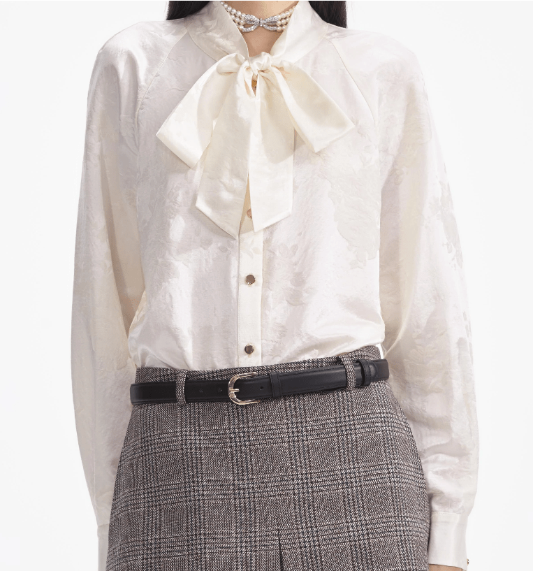 Polished to perfection in wool silk jacquard, this retro-chic pussy bow blouse plays well with baggy jeans and leather minis alike. Show off its neckline with a pair of our statement earrings.