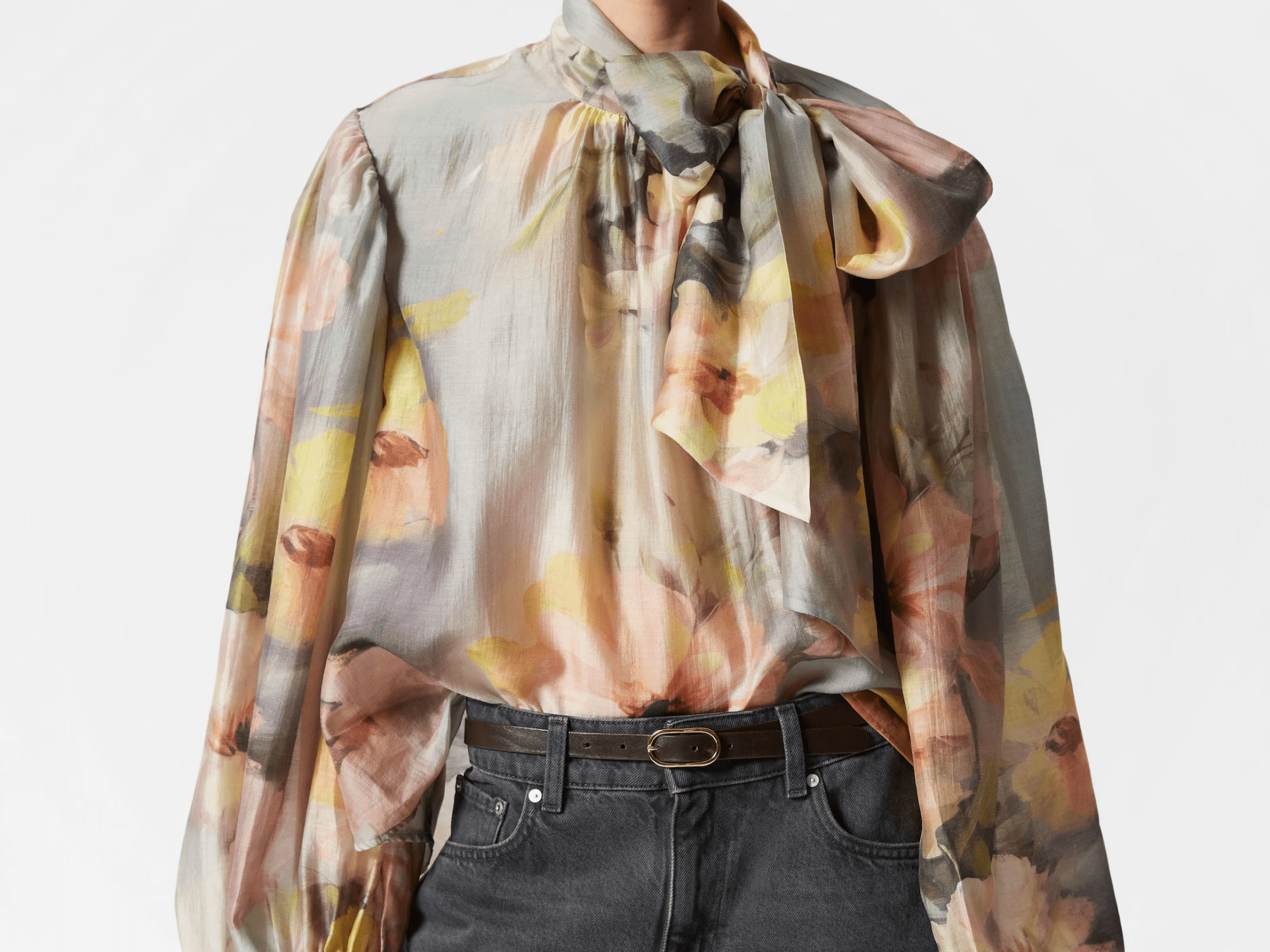 Puff-Sleeve blouse featuring a band collar with a self-tie bow detail at the neck.