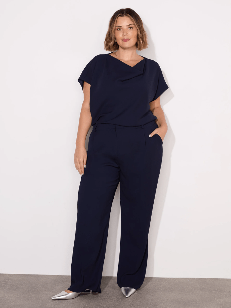In a gorgeous navy this cowl neck top is such a timeless wardrobe piece that you’ll be able to wear time and time again. It has a cowl neckline which is so flattering to wear and the short grown on sleeves create a beautiful silhouette. It slips on over your head with ease and looks great with our matching Navy Button Detail Wide Leg Trouser.