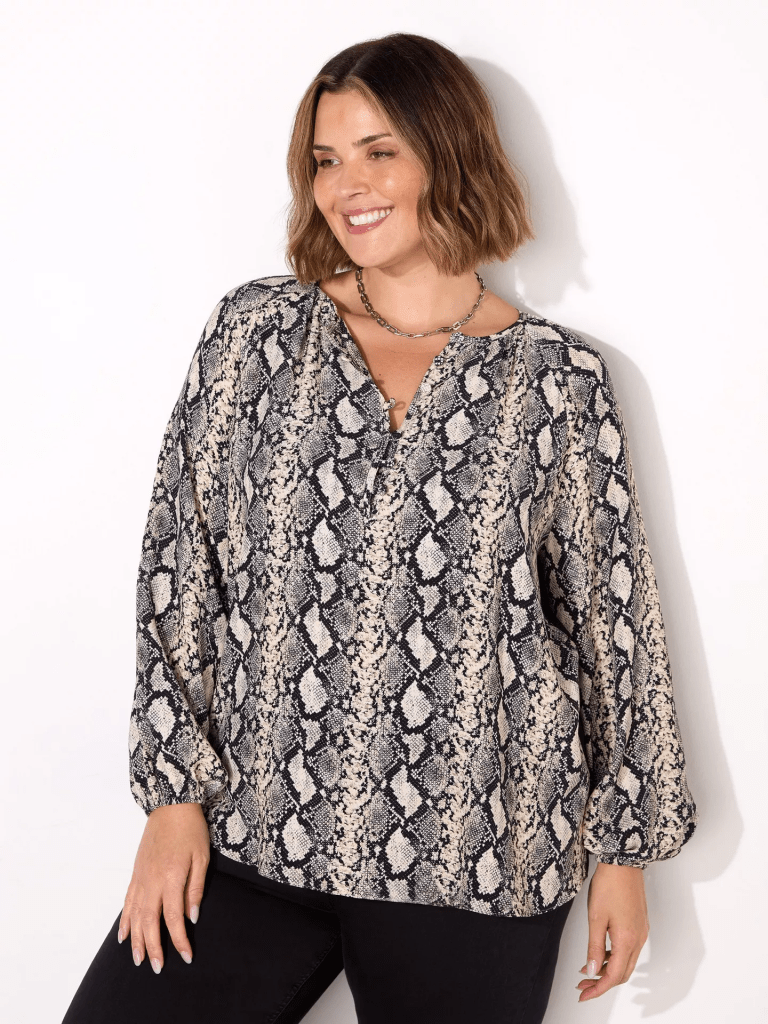 Cut from a gorgeous snake print woven fabric, this Button Front blouse is so comfortable, making you want to wear it time and time again. It has a gathered V neckline with a button fastening that is just so flattering to wear. The long raglan sleeves offer a beautiful movement and silhouette. It slips on easily over your head.