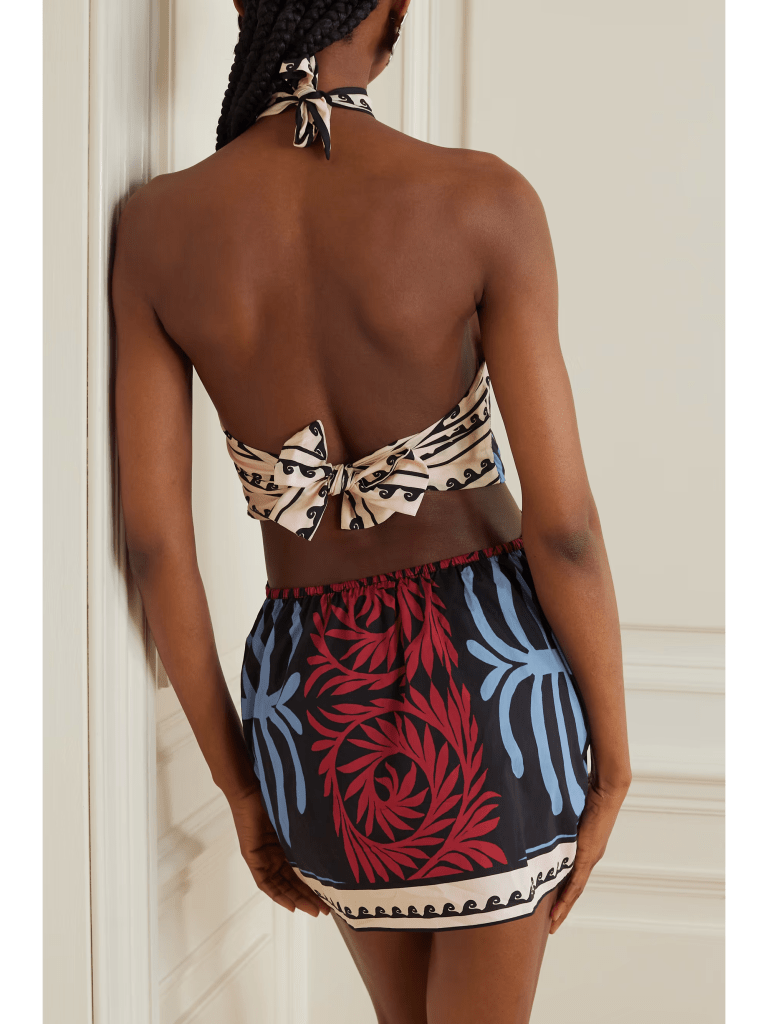 Johanna Ortiz’s beautiful prints are a joy to wear – this ‘Awash Mystery’ mini dress is patterned with a bold palm print and bordered with a beachy, wave motif. Made locally in Colombia from airy cotton-voile, it’s cutout to reveal the curve of your waist and has a sultry halterneck. Style yours with slicked-back hair and sandals.