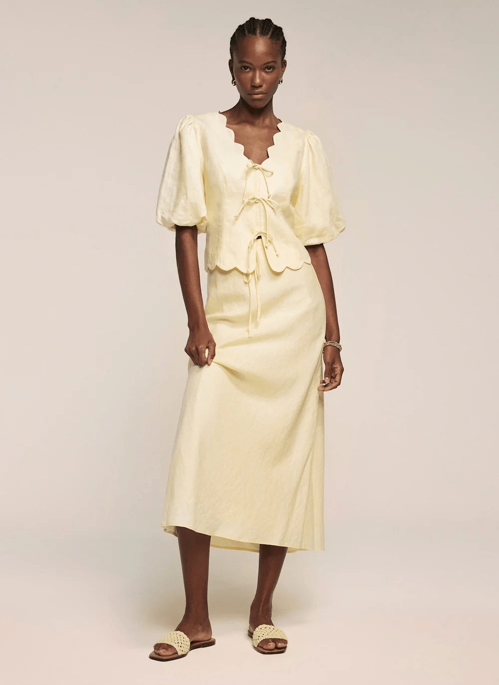 Cat is wearing the matching Mint Velvet Yellow Linen Maxi Skirt £99. Yellow tone skirt in a maxi silhouette featuring an elasticated waistband, A-line cut and a drawstring fastening through the front.