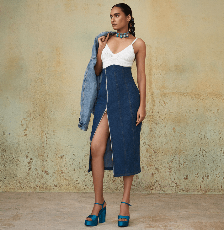 Josie’s skirt was identified as being from River Island, but I believe that it is in fact this skirt that she wore in January 2024: Karen Millen Contrast Stitch Detail Corset Waist Denim Midi Skirt £63.20 in Mid Blue (sold out). Sculpting the silhouette with a pencil fit, this contemporary maxi skirt is crafted from premium denim. Featuring a corset waist and stitch detail, invest in this skirt for a capsule wardrobe piece.