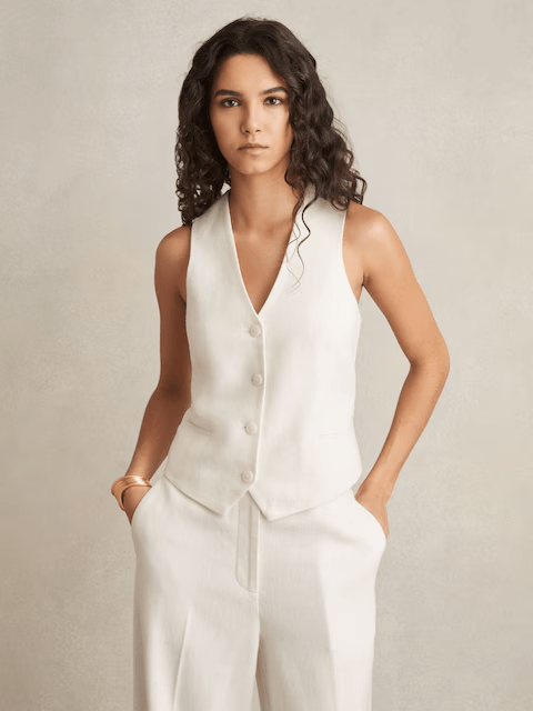 Sian’s trousers are the matching Reiss Devon Linen-Blend Wide-Leg Trousers/ £168 in White. The white Devon trousers are crafted from a lightweight linen blend, offering a relaxed yet polished silhouette. The wide-leg cut and pressed creases elevate the design, making them perfect for both casual and refined styling.