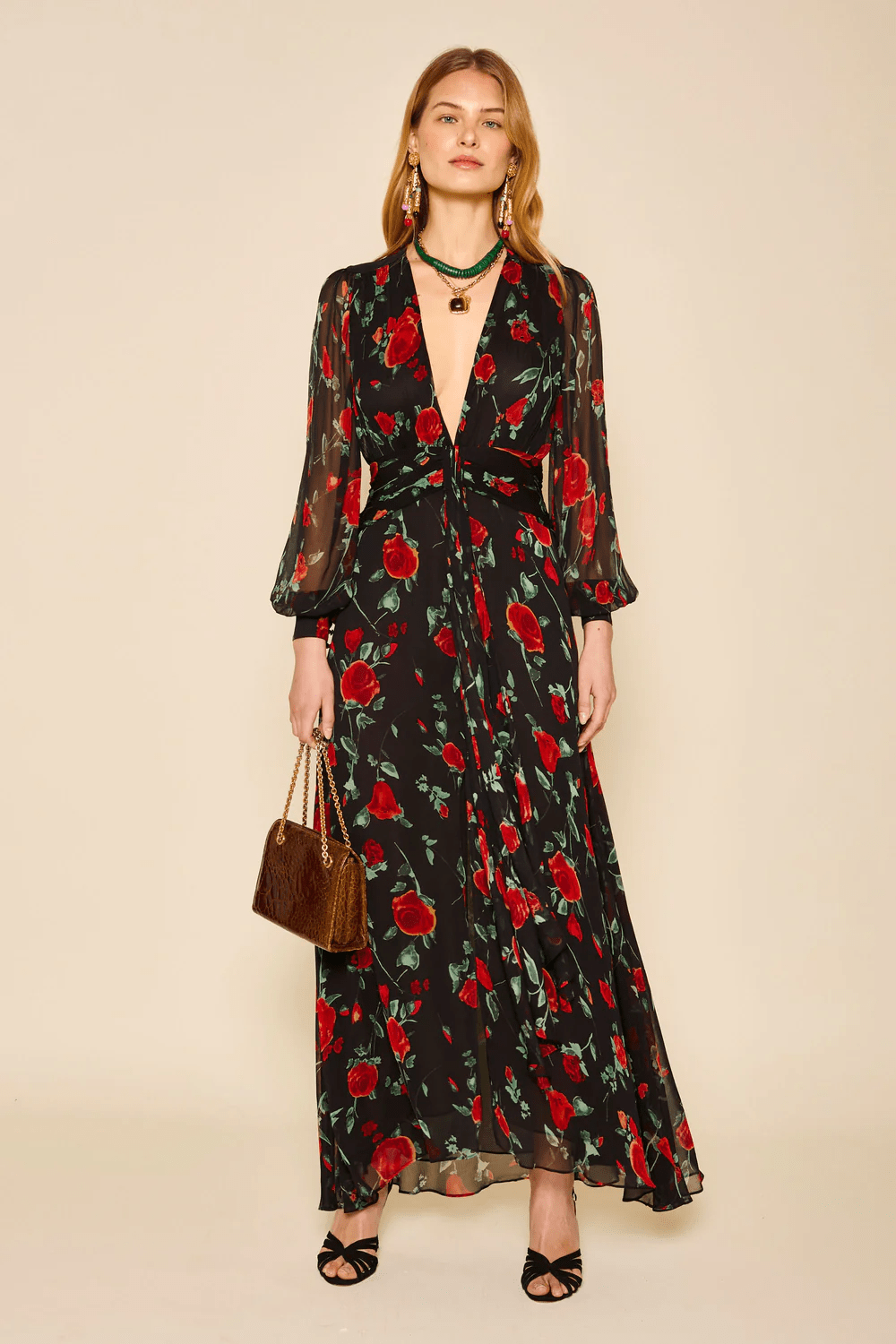 This Meera gown is an update on one of our bestsellers – the crinkled-chiffon feels extra special. Long sleeves balance the plunging neckline and the fabric is slit at the back to reveal a flash of skin.