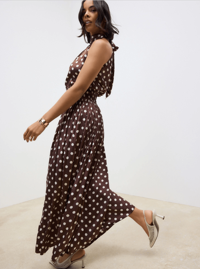 Cat’s skirt is the matching Next Brown Glossy Satin Polka Dot Maxi Skirt £50. Available in regular or petite sizing, this maxi-length skirt is decorated with a polka dot all-over print, featuring pleated detailing and a smooth satin fabric, finished with an elasticated wide waistband for a comfortable fit. Matching top available.