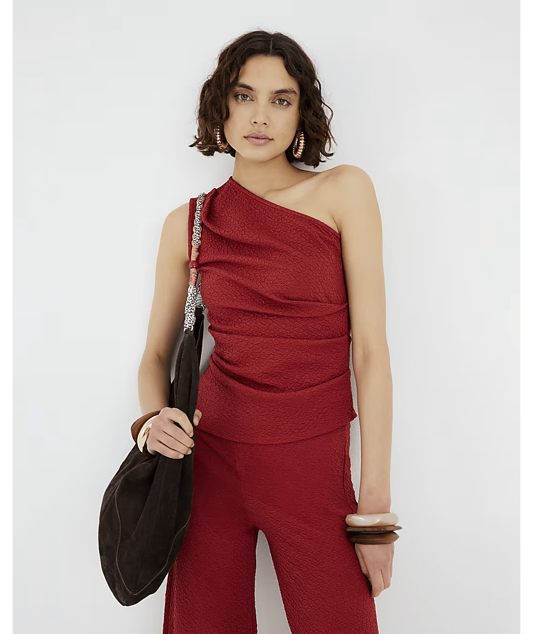 Textured fabric. Asymmetric neckline. Sleeveless. Ruched side detail.