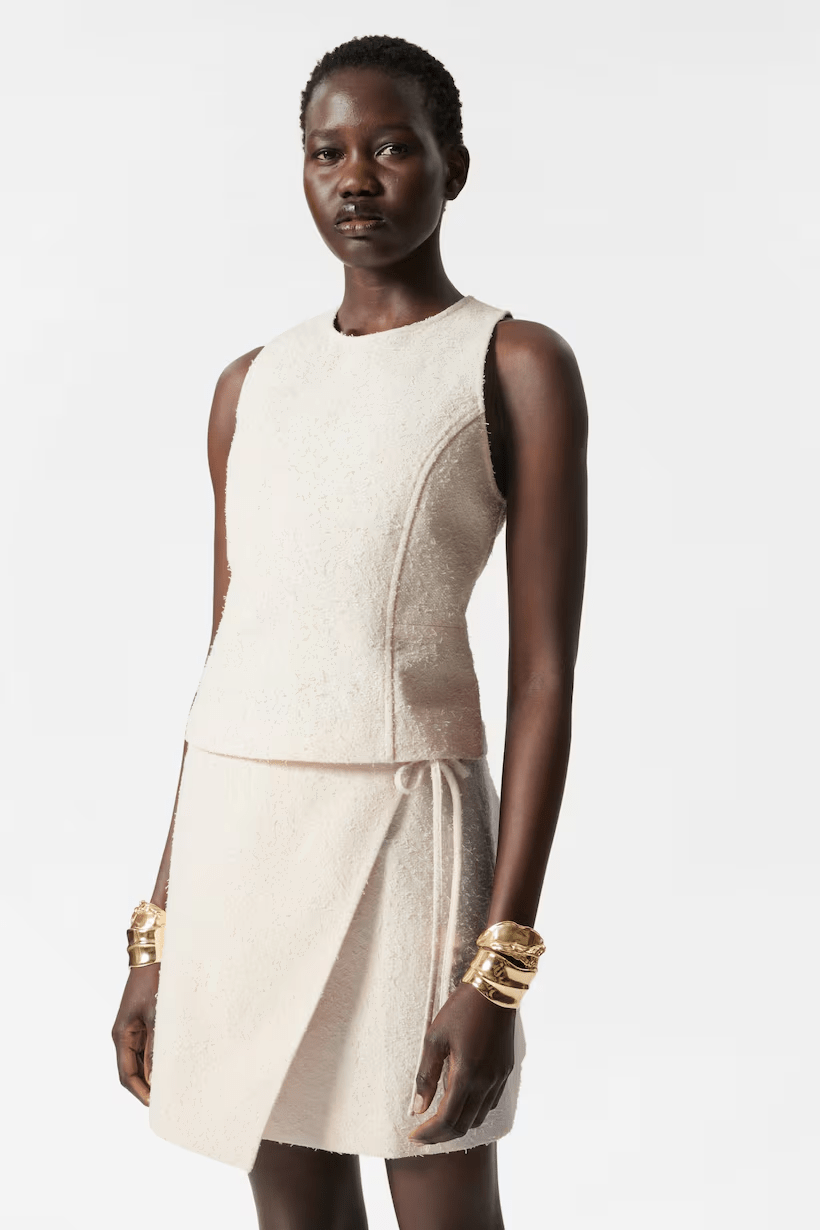 Sian’s skirt is the matching & Other Stories Wrap Mini Skirt £67 in White. This mini skirt is crafted from a sturdy cotton-blend, featuring a brushed, textured finish. It’s cut in an A-line silhouette with a wrapover design, completed with a concealed inside button and a thin tie-band at the waist.
