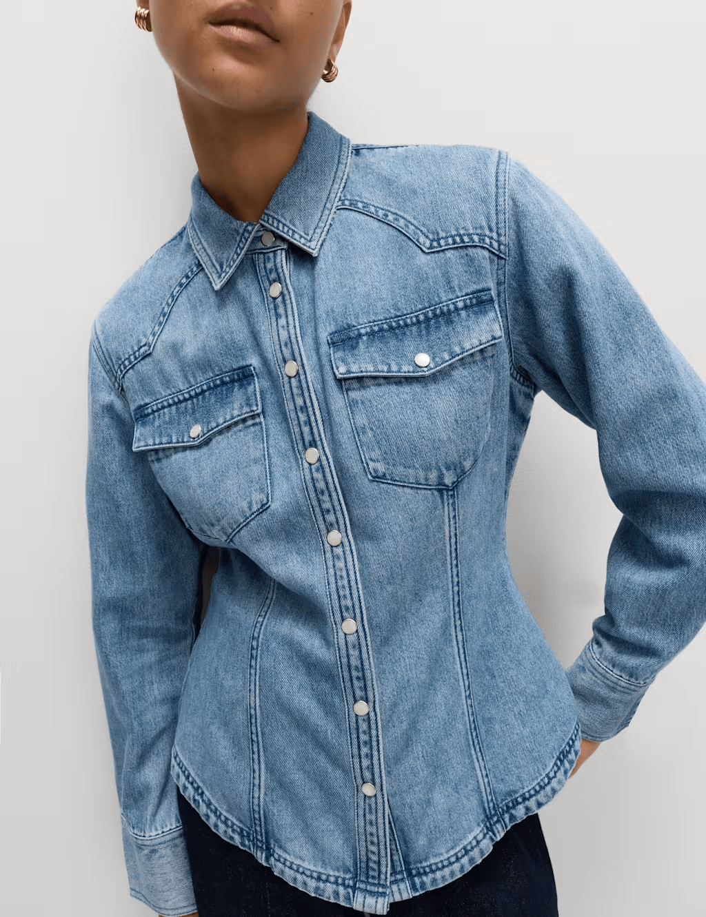 Embrace laid-back Western style with this denim shirt. Cut in a flattering slim fit, with a collared neck and button-through fastening. Two chest pockets add to the casual look. M&S Collection: easy-to-wear wardrobe staples that combine classic and contemporary styles.