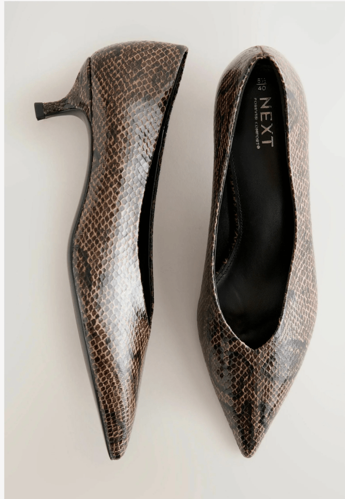 Alison’s shoes haven’t been identified, but look like these Next Chocolate Brown Snake Point Toe Low Slingback Kitten Heels $58 or Next Chocolate Brown Standard/Wide Fit Point Toe Low Kitten Heels Shoes $49.