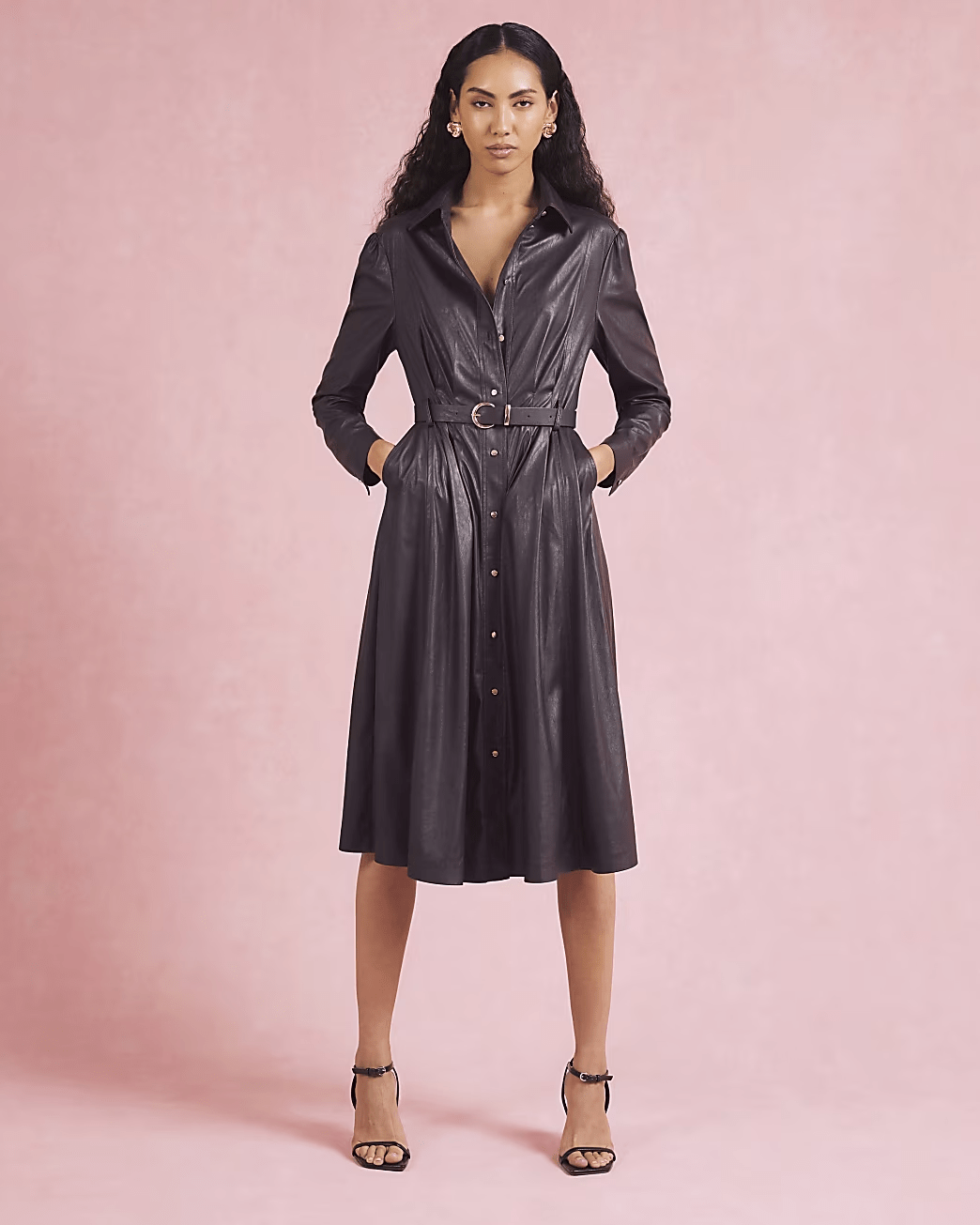Collar. Long Sleeve. Faux Leather. Fit and flare skirt. Belted. Button fastening.