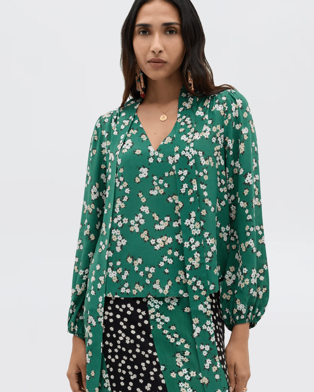 Vintage-inspired both in print and silhouette, our signature Moss blouse is beloved. Crafted from a silk Crepe de Chine it feels luxurious and drapes beautifully. The scarf neckline is a playful detail that works as a built-in accessory. Wrap one side around your neck and throw on a pair of your favourite sunglasses for a look that evokes old Hollywood glamour. Lightweight silk crepe de chine: elegant drape.