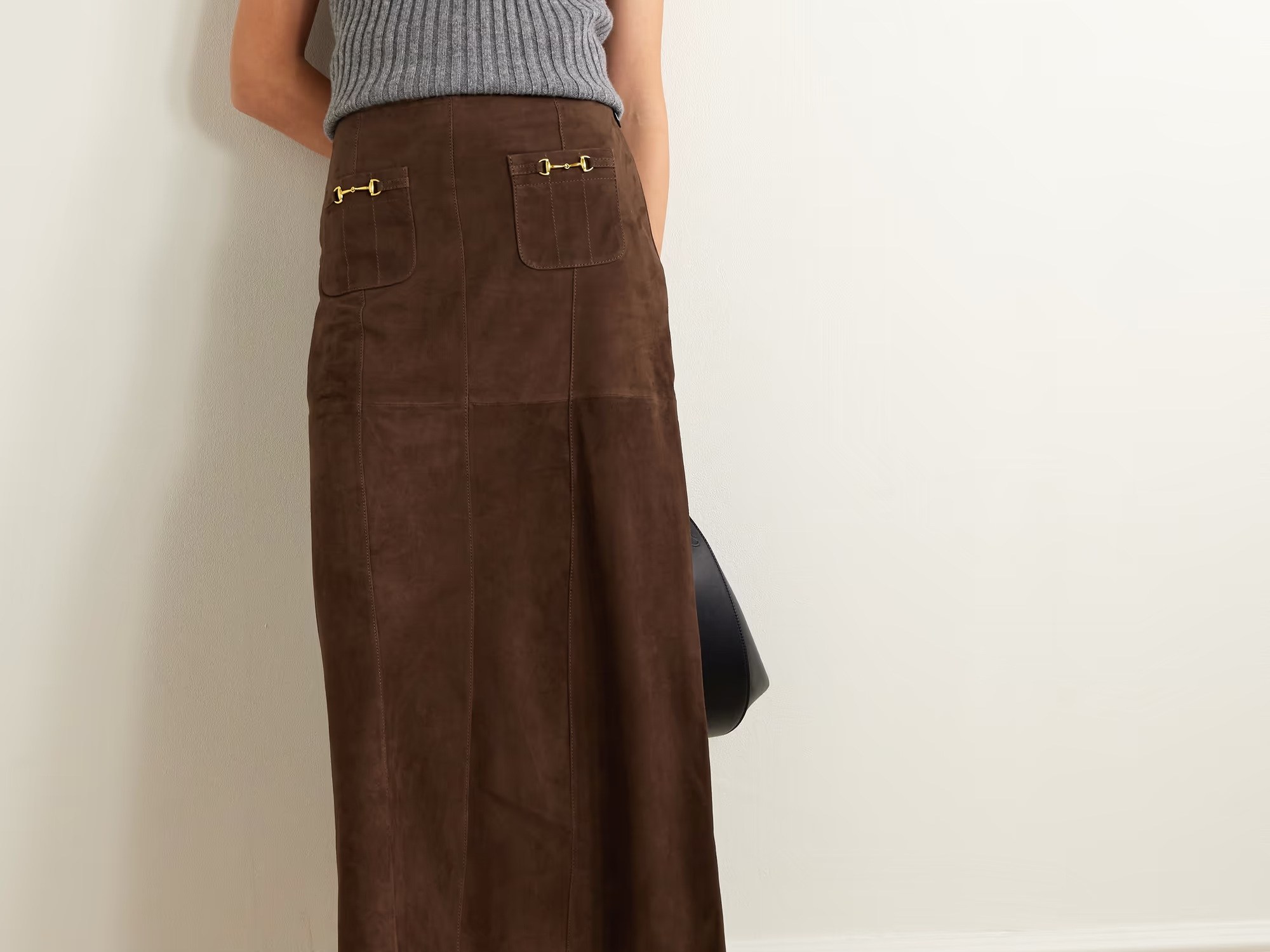 Orlagh McCloskey and Henrietta Rix’s love of vintage is felt in every RIXO design. This ‘Edwina’ midi skirt is made from panels of soft, supple suede in a high-waisted, A-line shape. Match your jewelry to the retro gold-tone horsebit hardware.