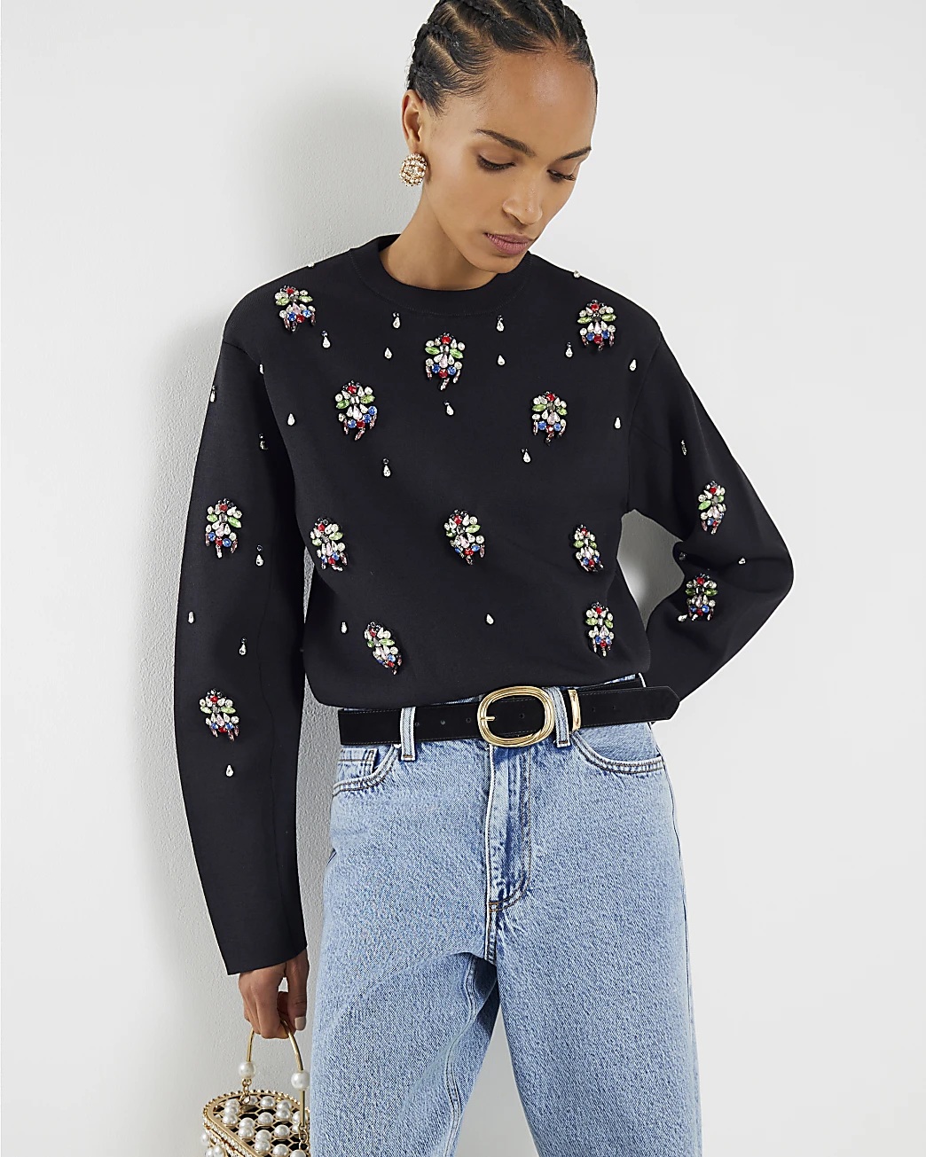 Cat wore a River Island Black Embellished Jumper £89, for This Morning on Monday 24th November 2025. Cat was styled by Rachael Hughes.