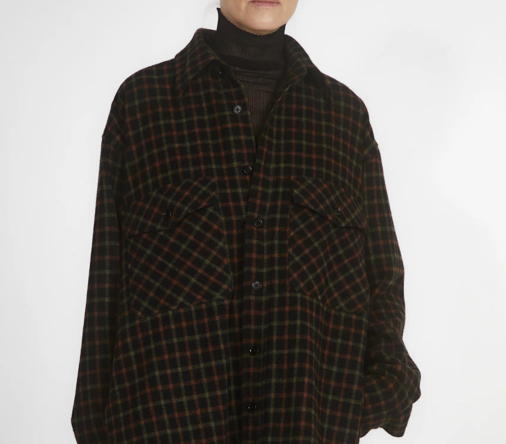 Oversized shacket|Mid-weight high-quality checked wool|Classic shirt collar|Front but ton closure|Patch pockets with but toned flaps|Side slits|Full-length sleeves with buttoned cuffs|Fully lined.