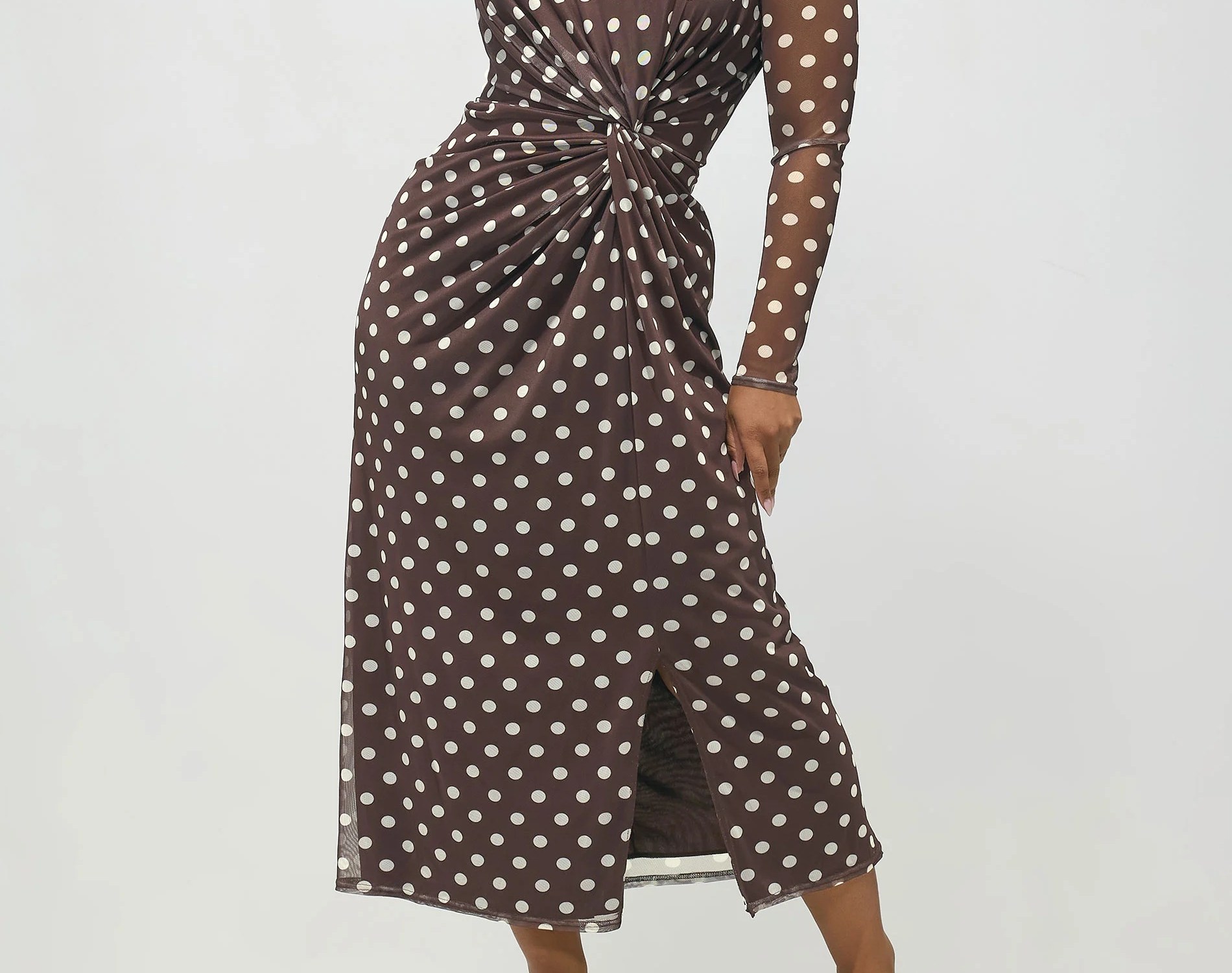 Make an entrance with our new-in maxi dress! Made from a comfortable jersey fabric, it features a polka dot design, long sleeves, a flattering scoop neckline and finishes in a mesh fabric. Style with your favourite heels and a clutch bag for the perfect evening look!