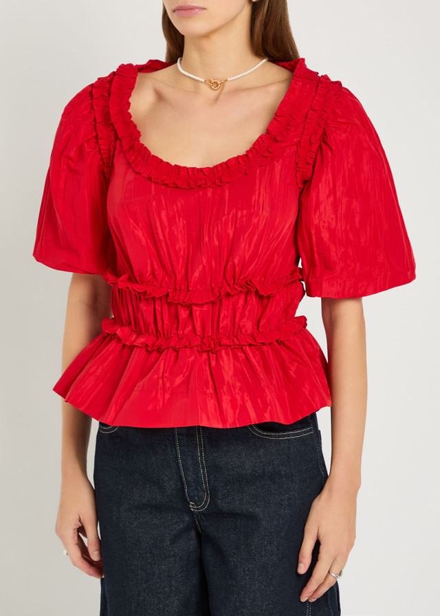 One top, endless moods. This red taffeta blouse is designed with removable puff sleeves, so you can switch up your look in seconds – wear it sleeveless or fully puffed up. It features a soft scoop neckline and ruffled detailing at the waist for extra shape and flair.