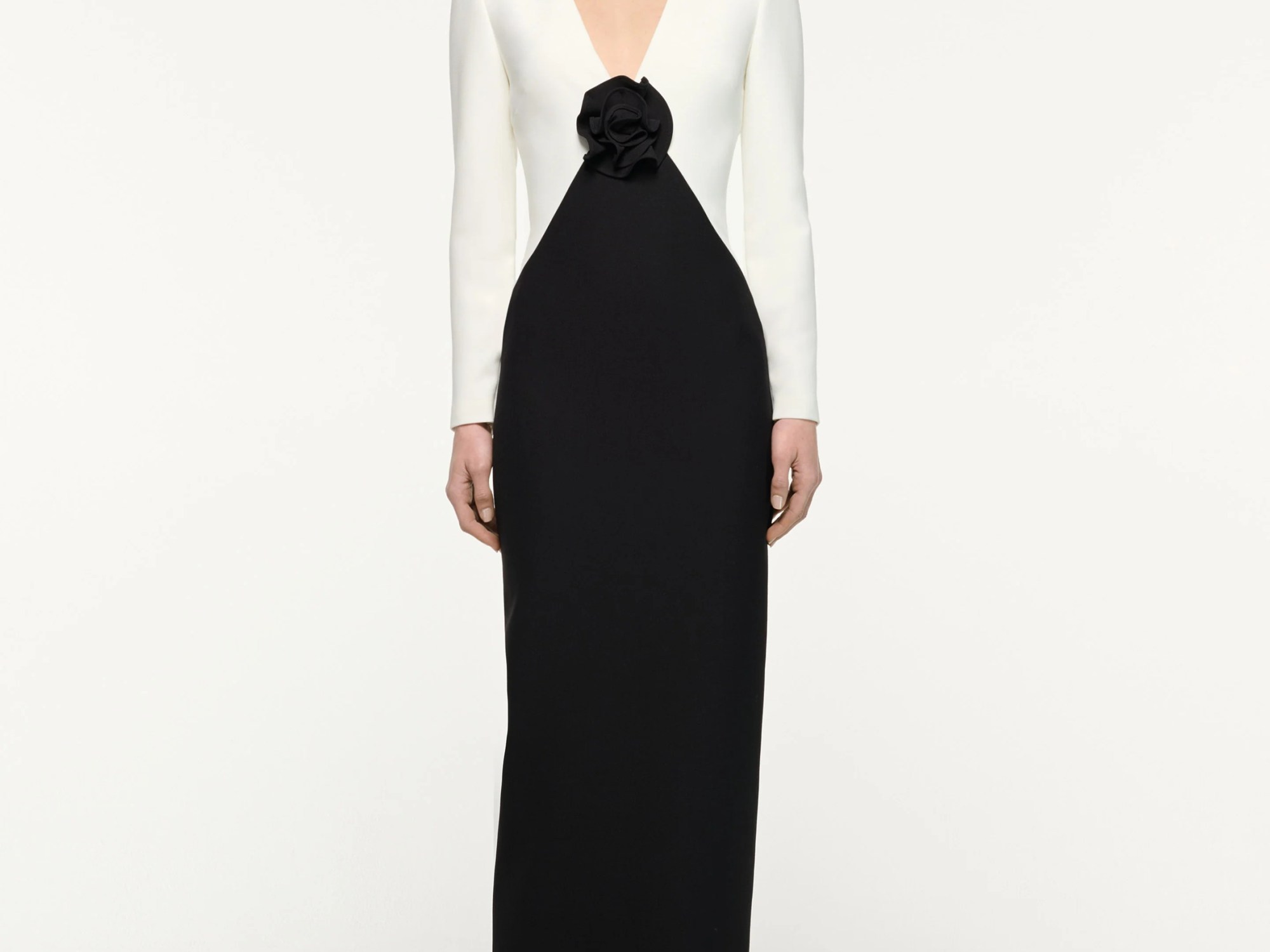 Dramatic dualities shape this long-sleeve column gown, crafted from black and white crepe. 3D rose appliqué adds visual drama, heightening the striking monochromatic contrast.