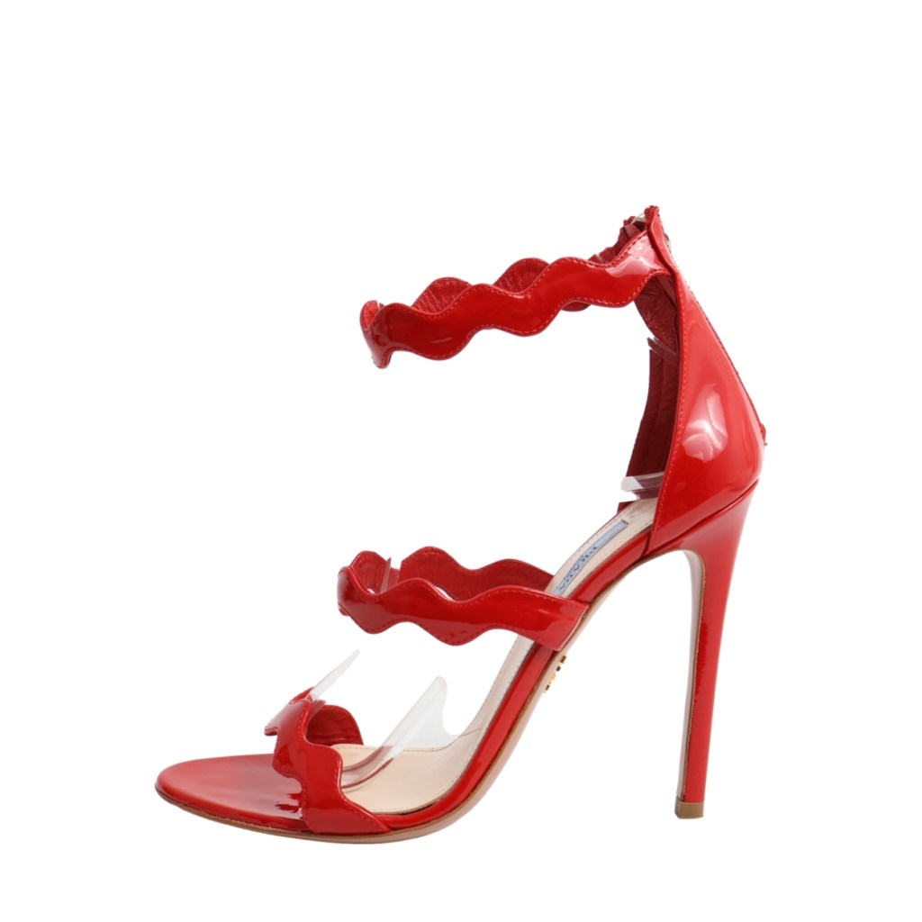 Holly’s shoes have not been identified, but look like these Prada Patent Scalloped Sandals in Red (sold out but available pre-loved).