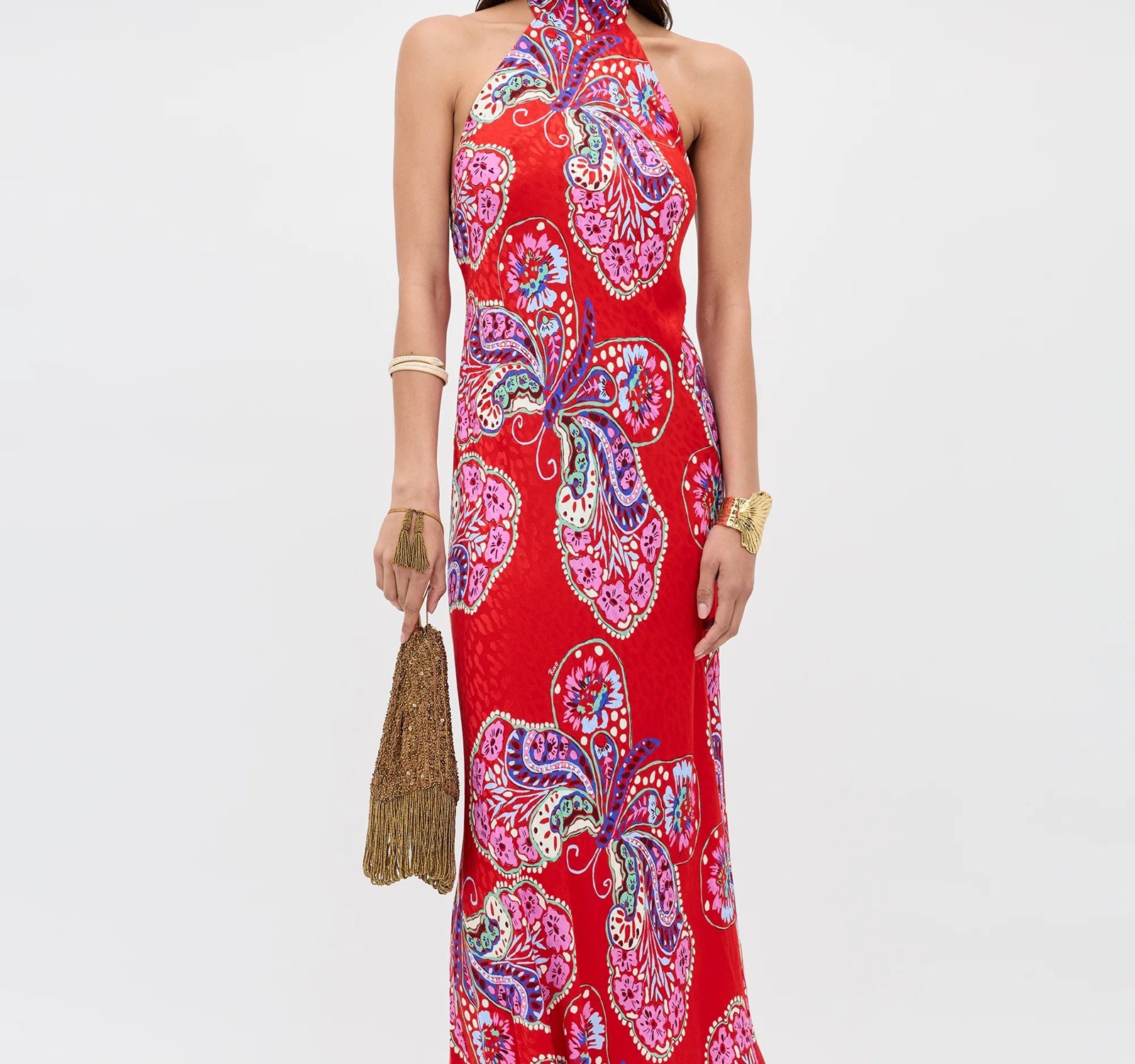 This Maura gown is elegant yet refined. Crafted from a tactile satin jacqaurd, its simple halter neck silhouette, which ties beautifully down an open back, exudes an understated glamour.