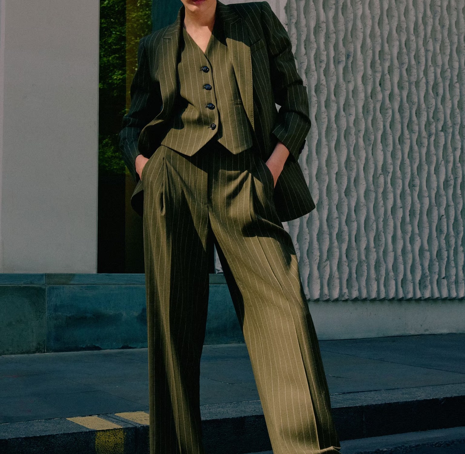 A staple that will never go out of style. This tailored vest is crafted from a wool-blend fabric that has a fluid yet slightly structured feel. It’s equipped with an adjustable back tab for a tailored-to-you fit and elevated with graphic pinstripes.